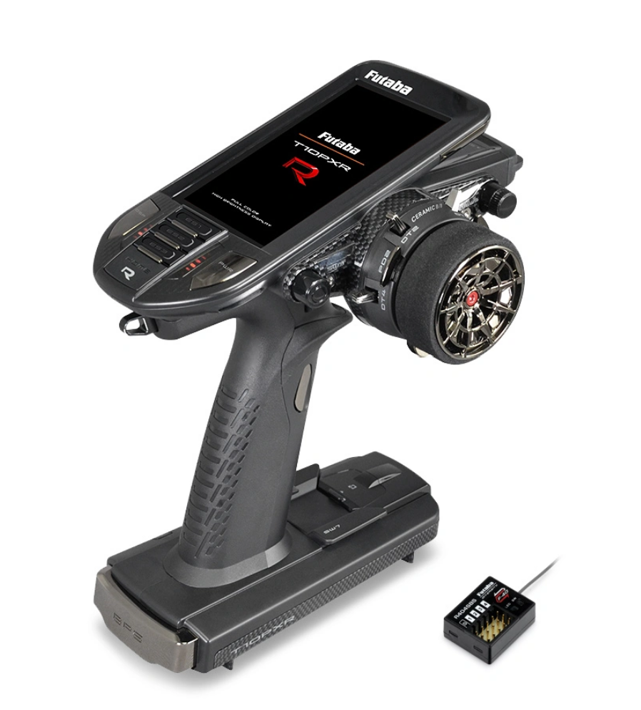 High-end model with fastest response function The T10PX, beloved by many top drivers, finally arrives with the "R" design. The meticulously crafted "T10PXR" symbolizes its evolution to compete on a new stage. The T10PXR is a transmitter compatible with "F-4G", "T-FHSS SR", "T-FHSS", "S-FHSS", and "MINI-Z" protocols. The R404SBS and R404SBS-E are receivers compatible with "F-4G". Features: Featuring the new "ASA (Adjustable Steering Angle Adapter)" mechanism. Steering wheel travel is continuously adjustable from 32° to 36°. This allows for easy fine-tuning of the steering feel to suit any situation. Ceramic ball bearings for the wheel and trigger. Compared to conventional metal ball bearings, ceramic ball bearings offer high precision, low friction, and high durability, resulting in an even smoother feel. Optimized signal processing design for the controls. High-level responsiveness and smoothness are achieved. Enjoy fast response and a user-friendly feel. The printed circuit board is also unified in red. A passion for red is evident in even the hidden details! Feeling Mode Expanded to 15 Levels. Equipped with a new Feeling Mode that can be adjusted to a total of 15 levels, allowing you to achieve the optimal operating feel in any condition. Equipped with a new function, "ST (Steering) Trim Memory". Instantly adjust the steering trim to a pre-set trim position. This simplifies trim adjustments, essential for long races with gasoline engines. Redesigned editing controls. Improved editing experience for faster, more accurate control. Plus, the Pilot LED now features seven customizable colors. Premium Black Plating. This adds a chic, eye-catching presence. It also reduces the distracting glare of sunlight outdoors, allowing you to focus on driving. Optimized Center of Gravity Balance. By revising the transmitter's internal structure, layout, and weight distribution, we've achieved a well-balanced grip feel and improved operability. In particular, the LCD mounting bracket has been changed to a glass fiber reinforced resin (GF) for reduced weight, optimal weight distribution, and increased rigidity. Thorough weight reduction reduces driving fatigue. Titanium screws: Titanium screws are used to fasten the housing. Magnesium material: Magnesium is used for the rigid components that support the circuit board and housing, contributing to high rigidity. Glass-Fiber Reinforced Plastic (GF) Front and Rear Steering Housings. The high-rigidity glass-fiber reinforced plastic (GF) housing features a luxurious carbon-look finish. Supporting the base of the steering wheel and the rear handlebar mounting points, it delivers a sense of security and handling. Furthermore, the main frame is also made of glass-fiber reinforced plastic (GF), ensuring superior rigidity and durability. Trigger Stopper Lineup Expanded. Now offers four levels of adjustment: 5%, 10%, 15%, and 20%. TFT (Two-Finger Throttle Lever). Includes an S-shaped curved brake lever. The trigger is operated by pinching it between your index and middle fingers. This reduces finger fatigue during extended braking. Furthermore, zero finger clearance during braking allows for faster and more stable braking than ever before. Dimpled Grip Rubber (3 sizes). Dimpled grip rubber has been added to ensure comfortable grip even in the most gripping situations. Redesigned 3-position switch, D/R, and ATL levers. Redesigned switch knob for improved operability. Trigger Unit Angle Adjustment (Infinitely Infinite). The trigger unit angle,...